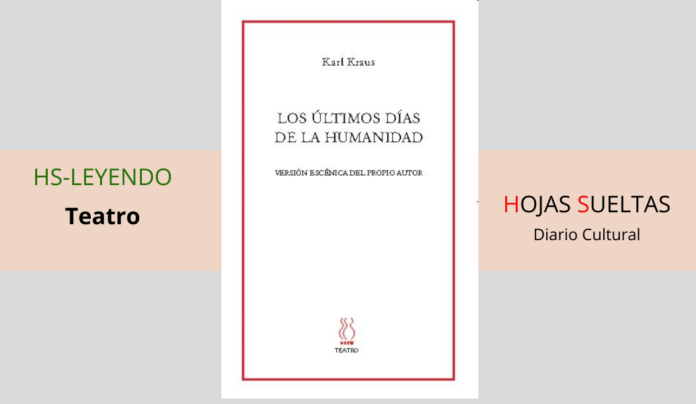 El escritor austríaco, Karl Kraus (1874-1936) fue el único que se atrevió a acometer la ingente tarea de presentar al público en vivo su visión particular de la guerra, o mejor dicho, de las circunstancias adyacentes a la guerra, y lo hizo desde la que fuera acaso la única perspectiva posible: la sátira, el esperpento. Los últimos días de la Humanidad (1922) es el resultado de la lucha que Kraus mantuvo contra la amnesia general que siguió –incluso dentro del mundo artístico- a la derrota austríaca y alemana en la Primera Guerra Mundial.