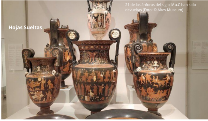 El Altes Museum de Berlín ha devuelto 25 antigüedades, incluidos 21 jarrones de Apulia, que se cree que fueron excavados ilegalmente y sacados de contrabando de Italia hace varias décadas.