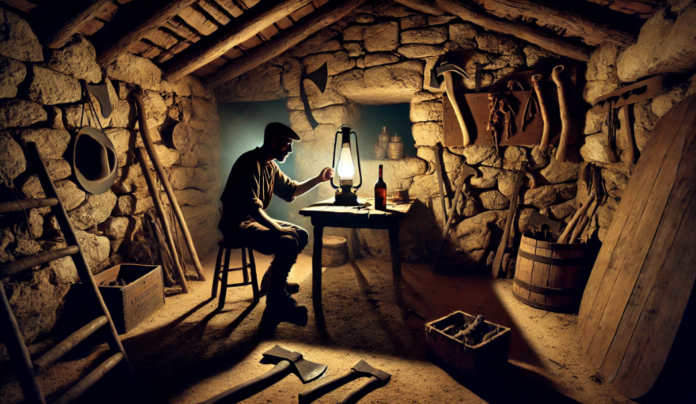 No está seguro de la disposición de los objetos colocados, o arrojados, sobre la única mesa. Hachas y hoces de diferentes tamaños. Un cuchillo de caza en una funda de cuero. Algún cepo cubierto de óxido. Dirige el candil hacia el suelo de tierra prensada y examina cuidadosamente la superficie en busca de huellas.