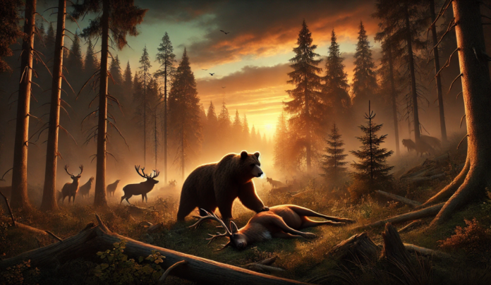 Hace mucho tiempo, poco después de que los animales se volviesen mortales, un oso cazó un reno. Lo hizo para saciar el enorme apetito que lo atormentaba desde que abandonó el lago sagrado. Tras derribarlo, desparramó sus vísceras por la tierra y empezó a gozar de su particular festín, haciendo saber al resto de los presentes que no estaban invitados. Lógicamente, ninguna criatura osó molestarlo. Nadie estaba lo suficientemente loco como para importunar a un oso hambriento.