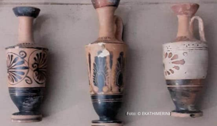 Los arqueólogos estatales catalogaron el hallazgo, que incluye 102 objetos antiguos como kylixes, cantaros, palanganas, lekythoi, skyphoi y figurillas, 36 artículos religiosos postbizantinos como iconos y platería eclesiástica, y monedas, medallas, piedras de sello y pesas desde la antigüedad hasta los tiempos modernos.