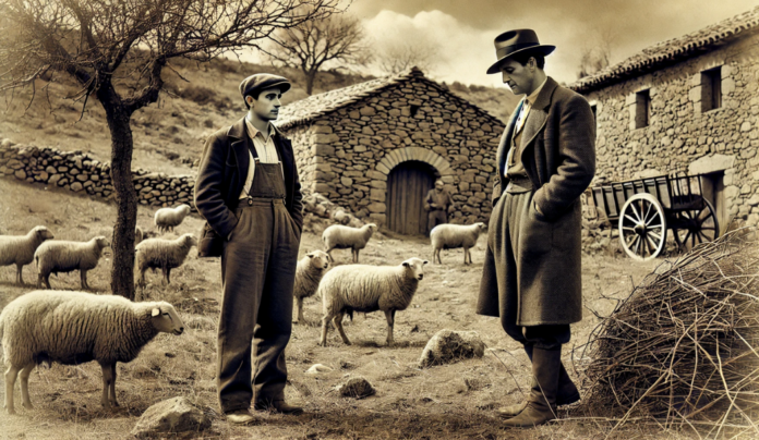 Deja el candil en la mesa de madera, mete la mano en el interior de la zamarra y saca el cuchillo de caza, abalanzándose sobre su primo Antonio. Antonio aprovecha los segundos que tarda en desenfundar el cuchillo y le agarra la muñeca con su mano izquierda, apretándola con fuerza.