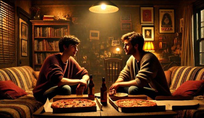 Más tarde, estaban ya sentados en el cómodo sillón del salón, mientras las pizzas se enfriaban un poco en los platos. Javier sacó unas cervezas frías. La tele estaba encendida al fondo, sin volumen.