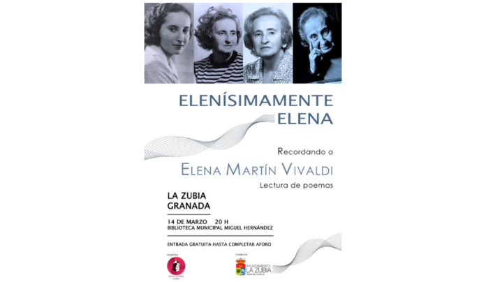 En torno a la celebración del 8 de Marzo, el Círculo Literario de La Zubia organiza un homenaje a la poeta granadina Elena Martín Vivaldi, que tendrá lugar el próximo viernes 14 de marzo a las 20 h en la Biblioteca Municipal Miguel Hernández de La Zubia. El acto estará presentado por Alicia Choín y en él participarán Marina Tapia, que realizará una introducción sobre el papel de la mujer en la literatura, y Rosa Gamero, que hablará sobre la figura de Elena Martín Vivaldi. Posteriormente se llevará a cabo una lectura de poemas de la poeta granadina a cargo de los escritores Alicia Choín, Susana Drangosh, Rosa Gamero, Varo Huertas, Manuel Molina, Rosa Morillas, Rosa Ortega, Juan Carlos Rodríguez Torres, Paqui Sánchez y Marina Tapia.