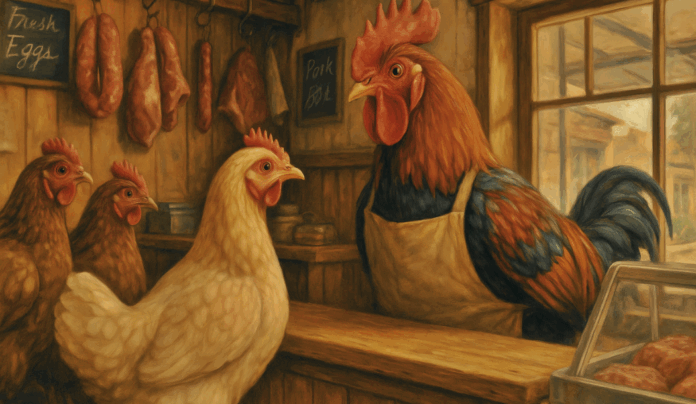 Una mañana soleada en el pueblo de Gallineras, una joven pollita llamada Pili entró en la carnicería del Pollo Pepe, con una sonrisa radiante. Sin esperar su turno, se acercó al mostrador.