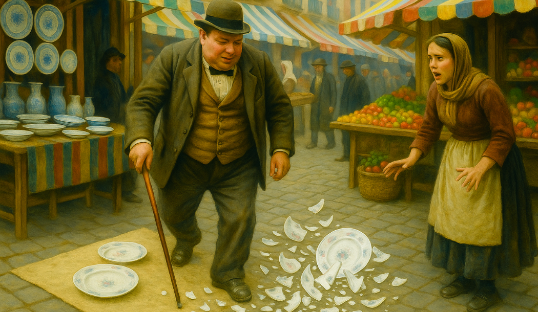 Al ver la desolación en el rostro de la joven, la ira de la multitud se dirigió hacia el mercader. Gritos de reproche y exigencias de disculpas resonaron en el mercado. El hombre, ajeno al clamor popular, solo se percató de la magnitud de su desaguisado cuando el bastón, ya sin platos que romper, golpeó el suelo con un sonido seco.