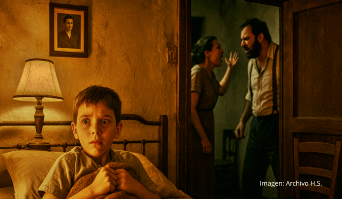 Una de las noches salió de su habitación desvelado por los gritos y recorrió el largo pasillo que le separaba del resto de la casa. En el comedor, encontró lo que esperaba: su padre azotando a su madre con la hebilla del cinturón. Manchas de sangre en la funda de ganchillo de uno de los sillones desvencijados. Golpes de los vecinos en el suelo y en el techo, en las paredes.
