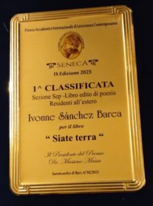 La poeta y artista española Ivonne Sánchez Barea ha sido galardonada con el Primer Premio en la categoría Libro editado de poesía (Sezione SEP) en la IX Edizione del Premio Internazionale di Letteratura Contemporanea “Seneca”, celebrado en Bari (Italia) en 4 octubre 2025, por su obra Siate Terra. El reconocimiento consolida su voz dentro del panorama internacional de la poesía contemporánea, y supone un paso más en una trayectoria marcada por la fusión entre palabra, arte y conciencia ecológica.