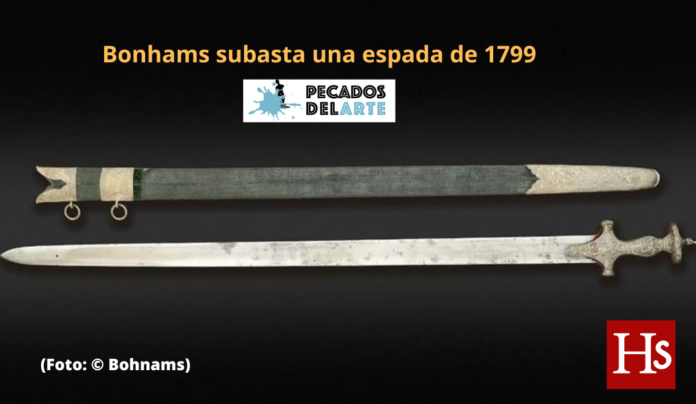 — > Según informa la SALA DE SUBASTAS BONHAMS, el pasado 23 de mayo se subastó la espada hindú conocida como Sable de Cabecera del Sultán Tipú. Las pujas llegaron ghasta los 14 millones de libras, un precio que dijo Bonhams es un récord de subasta para un objeto islámico e indio.