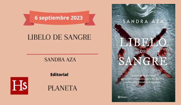 Sandra Aza: Licenciada por la Universidad Complutense de Madrid, Sandra Aza es una abogada que, tras ejercer el Derecho en el departamento procesal del despacho Uría Menéndez durante años, colgó la toga para partir rumbo a la conquista de un sueño: escribir una novela que, de un lado, rindiese homenaje a Madrid y su historia, y, de otro lado, describiese un procedimiento inquisitorial desde una perspectiva objetiva, sin templar la dureza de sus métodos, pero evitando, a la vez, recrearse en el morbo. Tras aprobar dos oposiciones en la Comunidad de Madrid, se sumió en un intenso período de documentación e investigación histórica, fruto del cual nace Libelo de sangre.